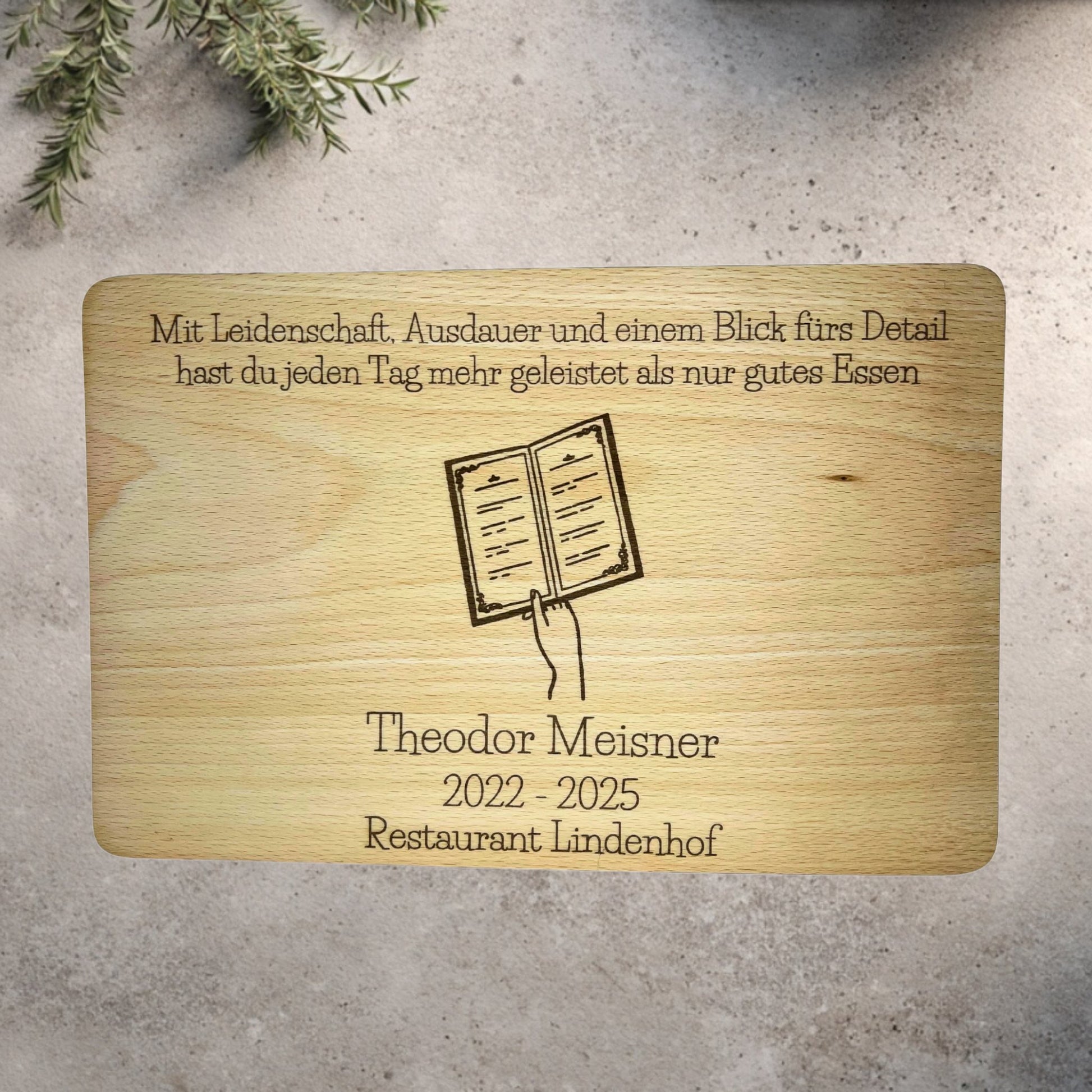- Unten: kostenlos personalisierbare drei Zeilen (Name, Jahr, Restaurant/Team)