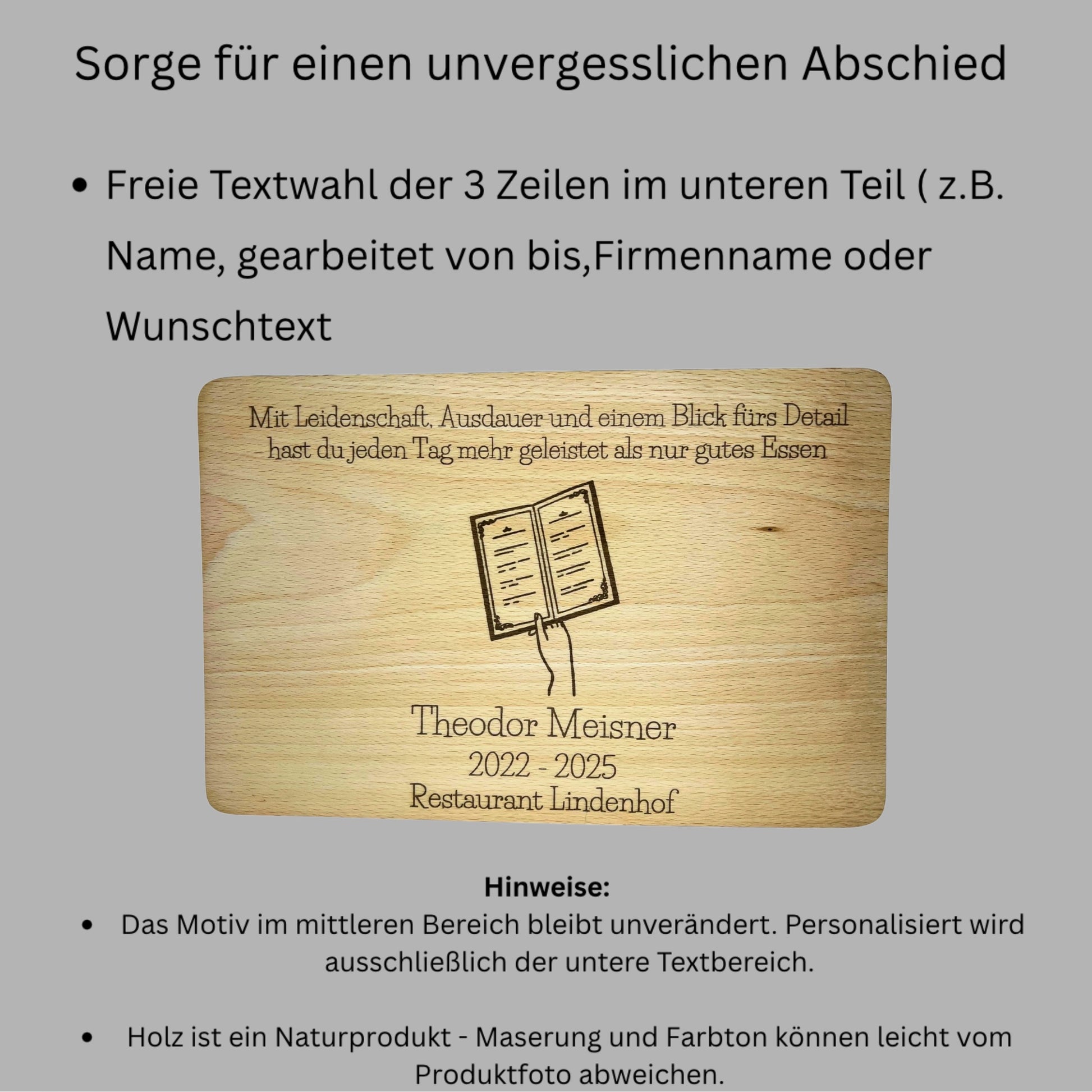 Praktisch, robust und mit einer Extra-Portion Gastro-Humor – diese Holztafel ist das perfekte Abschiedsgeschenk für Gastronomen. Oben steht ein festgelegter Abschiedstext, in der Mitte prangt das Gastro-Symbol, und unten kannst du drei Zeilen individuell personalisieren – zum Beispiel mit Name, Jahr und Restaurant/Team. Ideal, um gemeinsame Arbeitszeit gebührend zu würdigen.