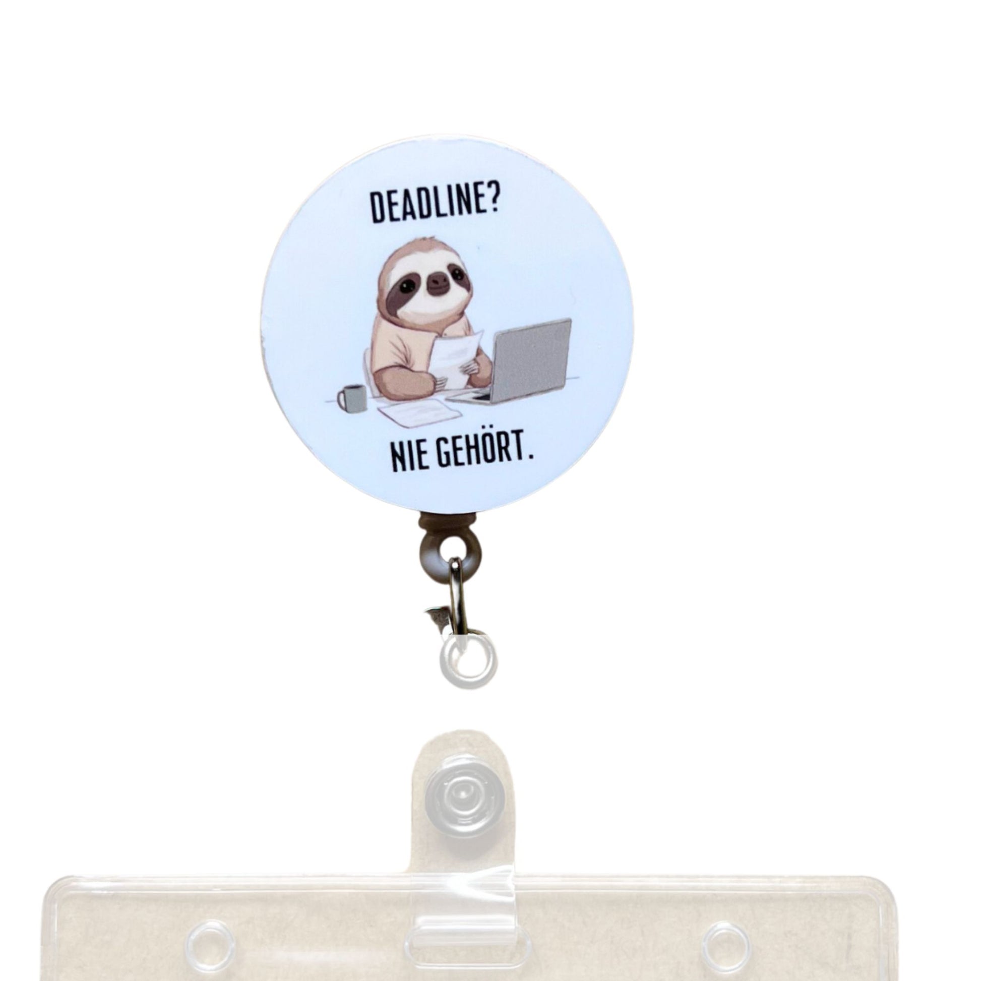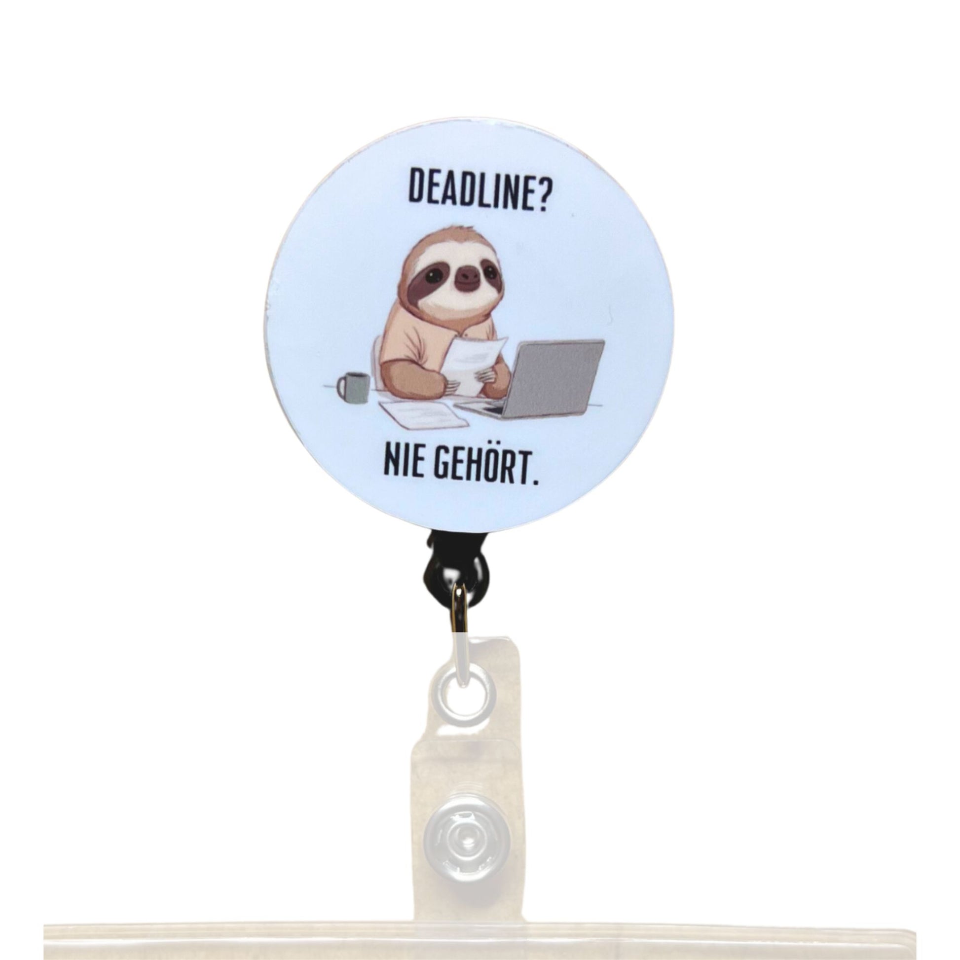 Du erhältst einen Ausweishalter mit Ziehband (schwarz oder weiß), ein magnetisch wechselbares Acryl-Design „Deadline“ in weiß sowie eine transparente Ausweishülle für deinen Mitarbeiterausweis. Dank Magnet lässt sich das Design jederzeit schnell austauschen – ideal zum Sammeln und Variieren.