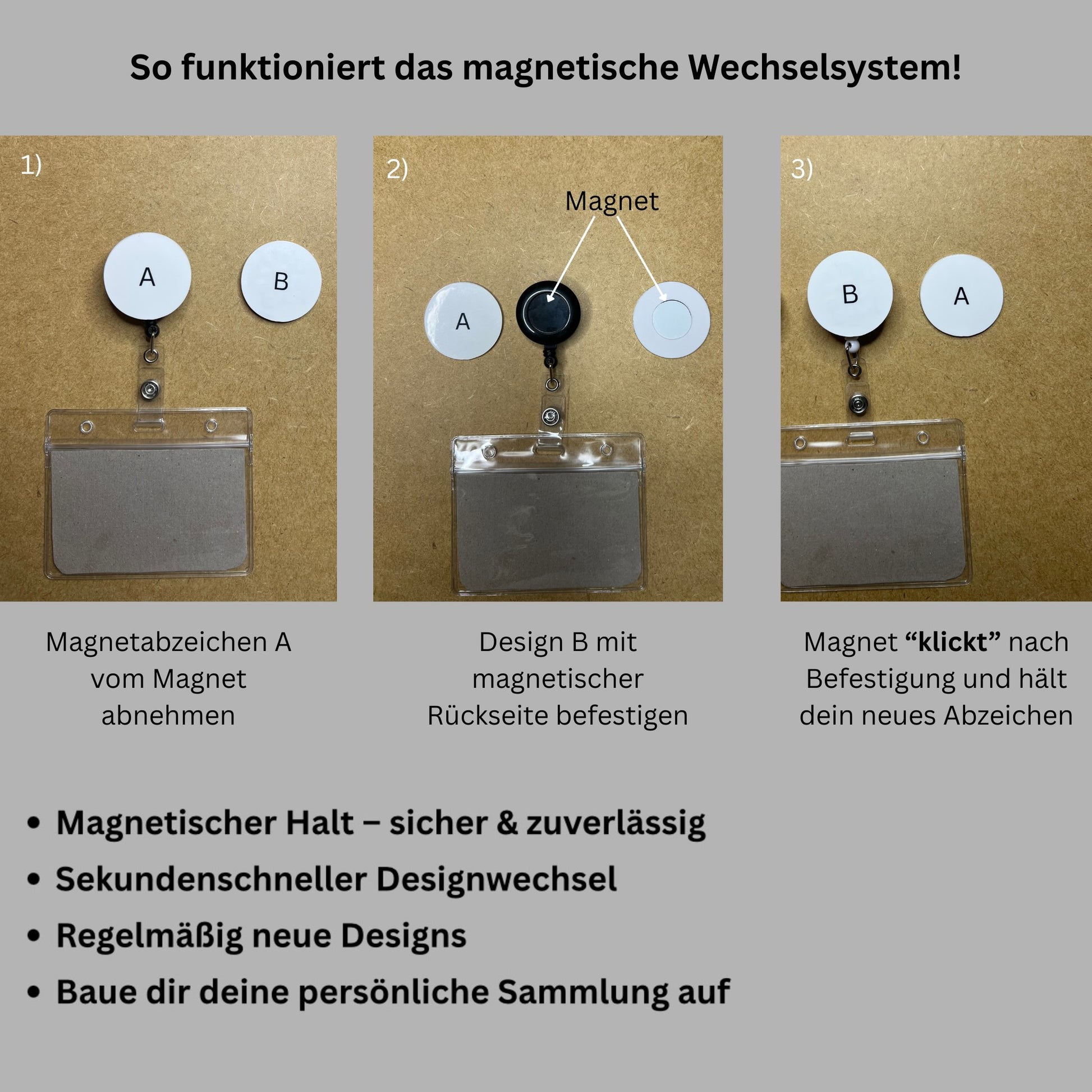 Du erhältst einen Ausweishalter mit Ziehband (schwarz oder weiß), ein magnetisch wechselbares Acryl-Design „Niemals aufgeben“ in weiß sowie eine transparente Ausweishülle für deinen Dienstausweis. Dank Magnet lässt sich das Design jederzeit schnell austauschen – ideal zum Sammeln und Anpassen an Stimmung oder Einsatz.