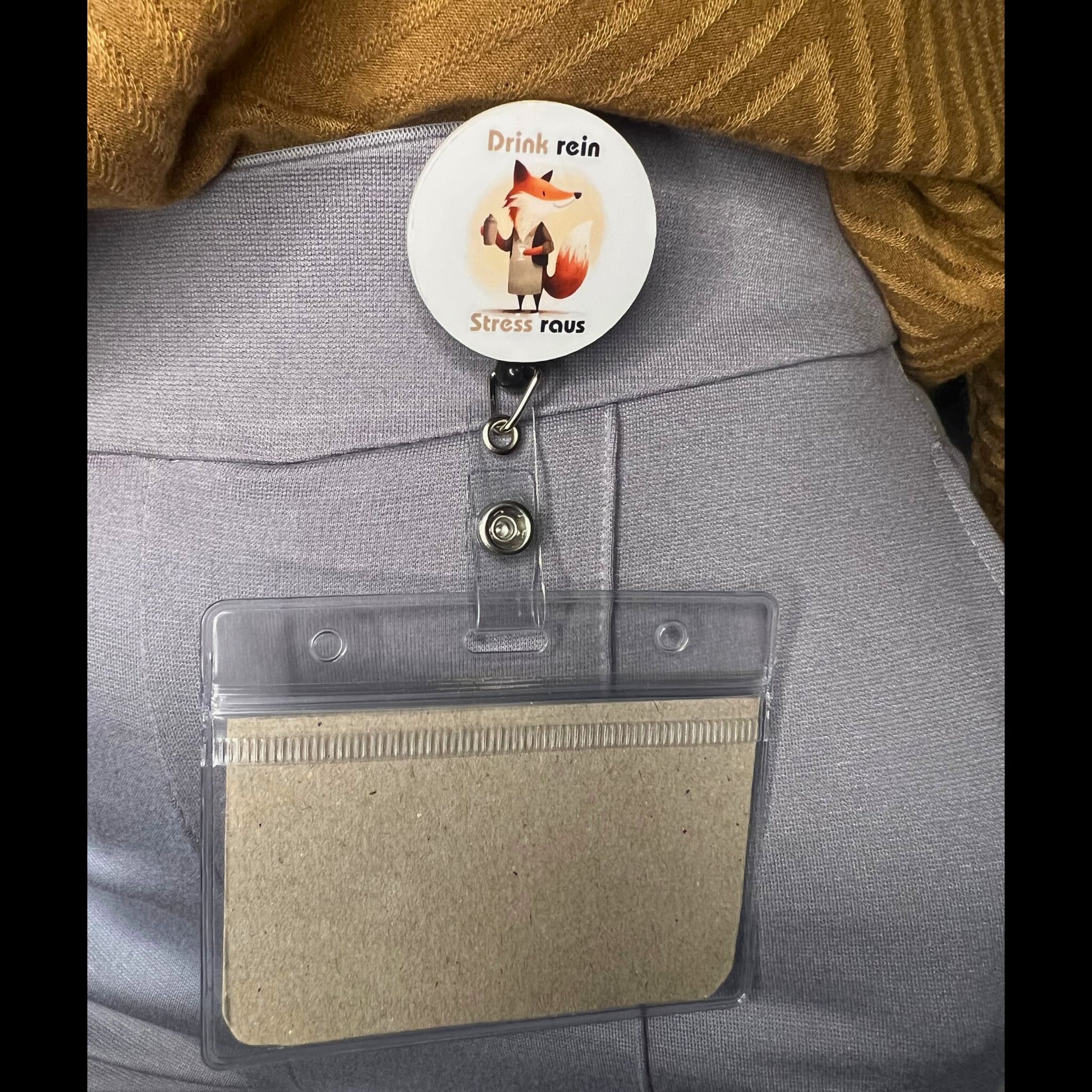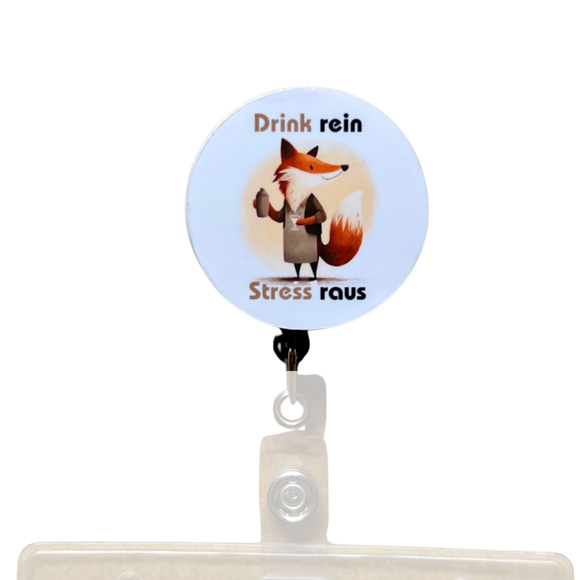 Du erhältst einen Ausweishalter mit Ziehband (schwarz oder weiß), ein magnetisch wechselbares Acryl-Design „Drink rein“ in weiß sowie eine transparente Ausweishülle für deinen Mitarbeiterausweis. Dank Magnet lässt sich das Design jederzeit schnell austauschen – ideal zum Sammeln und Wechseln je nach Schicht oder Stimmung.