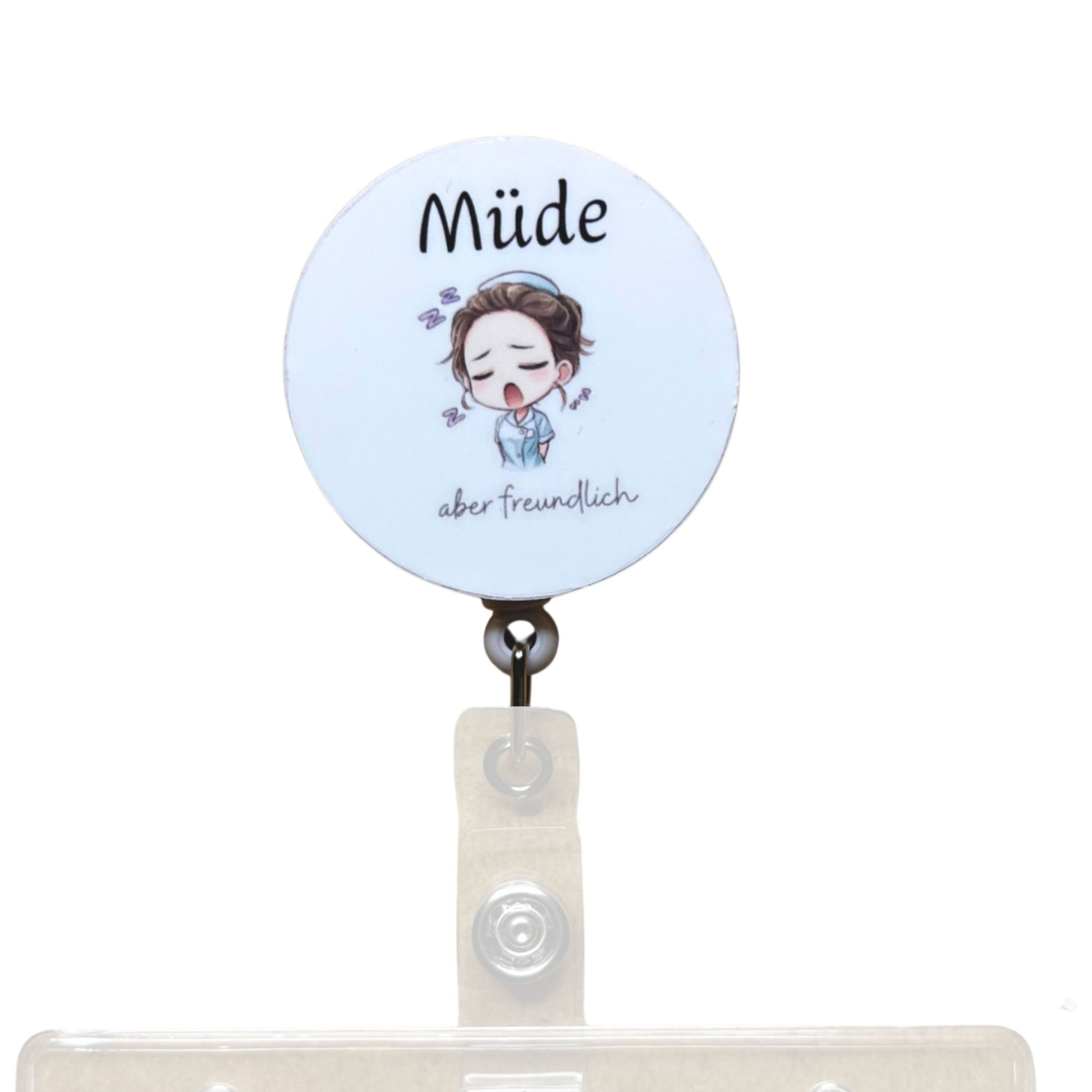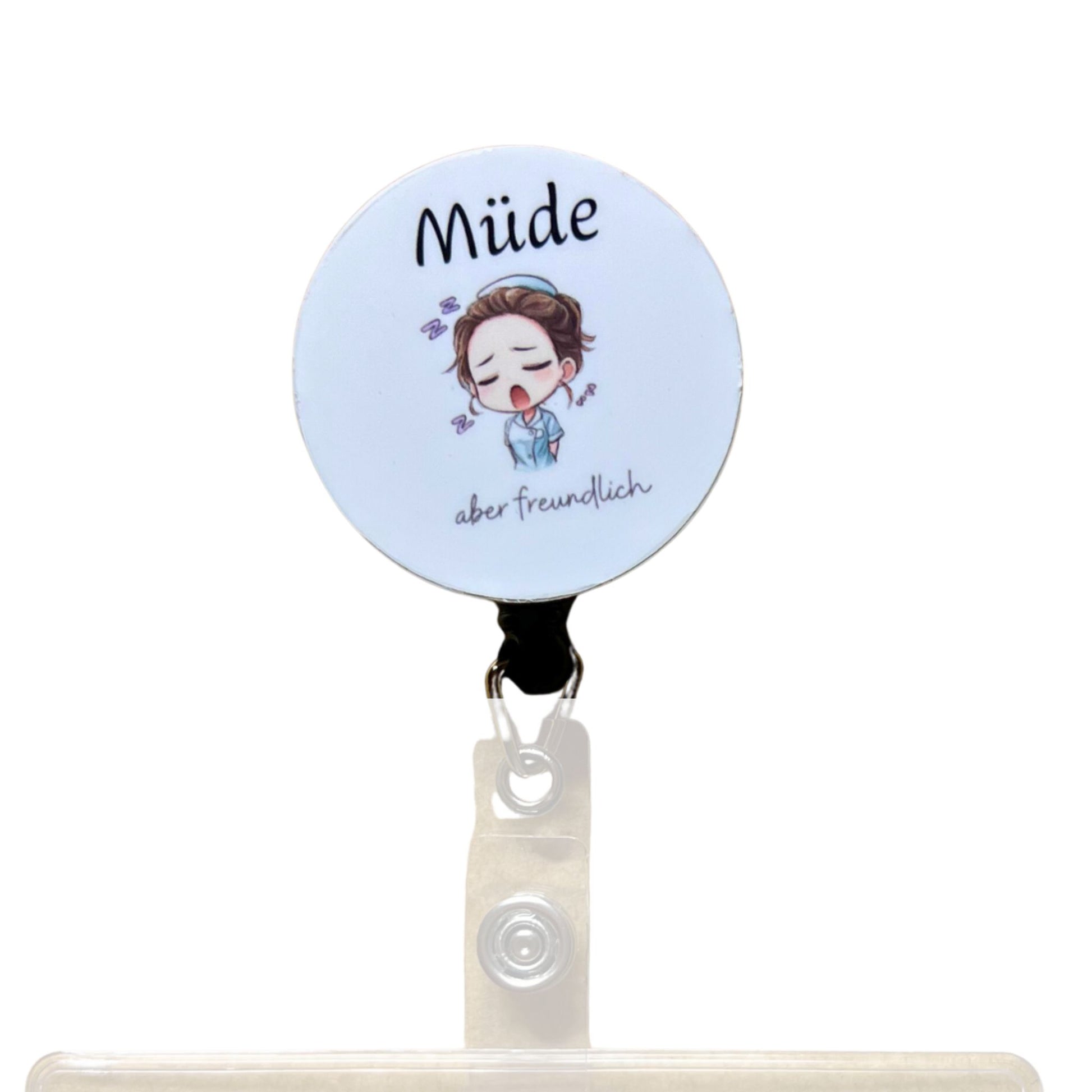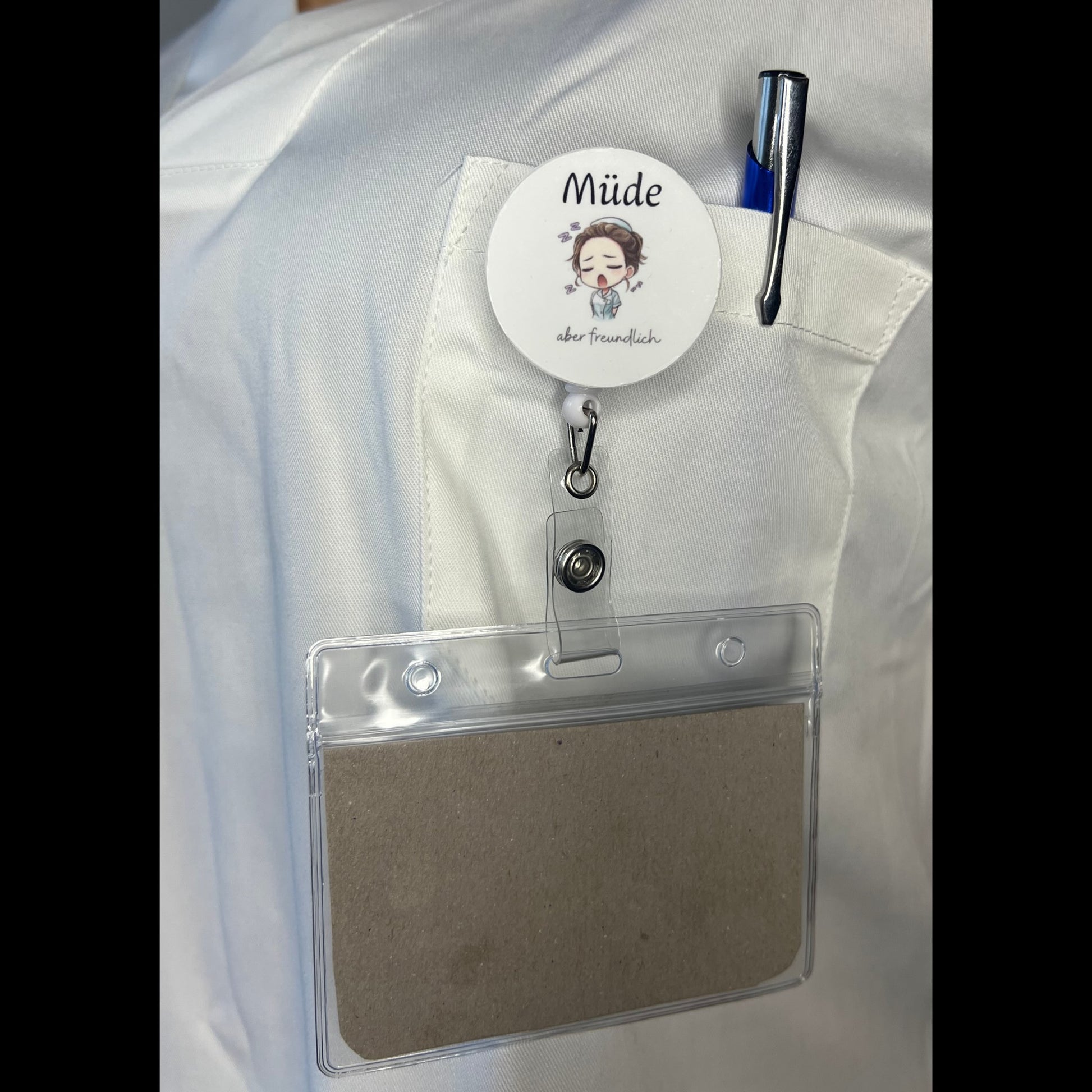 Du erhältst einen Ausweishalter mit Ziehband (schwarz oder weiß), ein magnetisch wechselbares Acryl-Design „Müde“ in weiß sowie eine transparente Ausweishülle für deinen Mitarbeiterausweis. Dank Magnet lässt sich das Design jederzeit schnell austauschen – ideal zum Sammeln und Variieren je nach Schicht oder Stimmung.