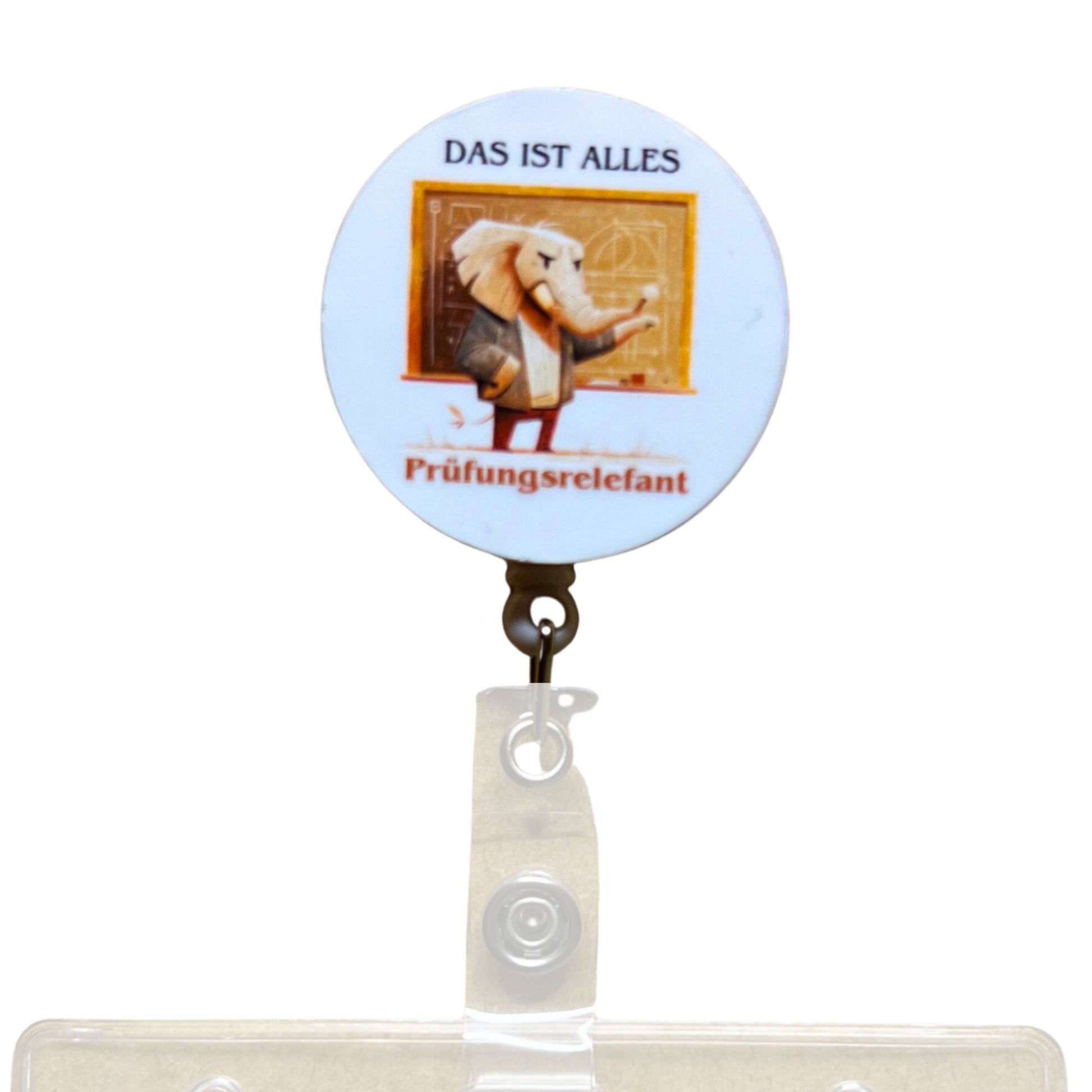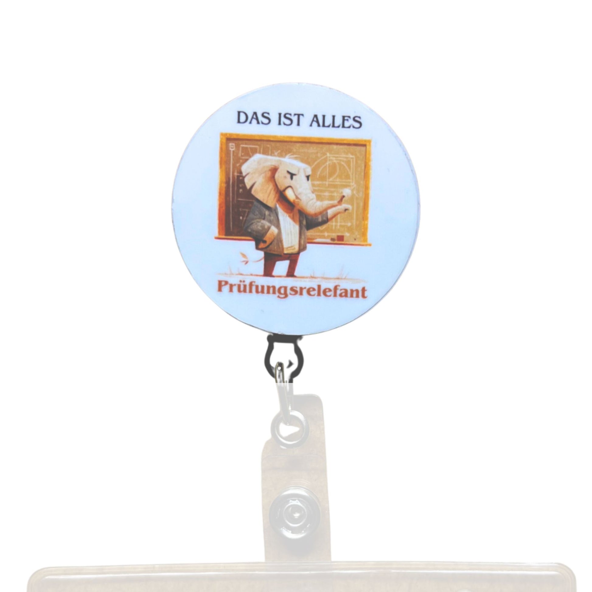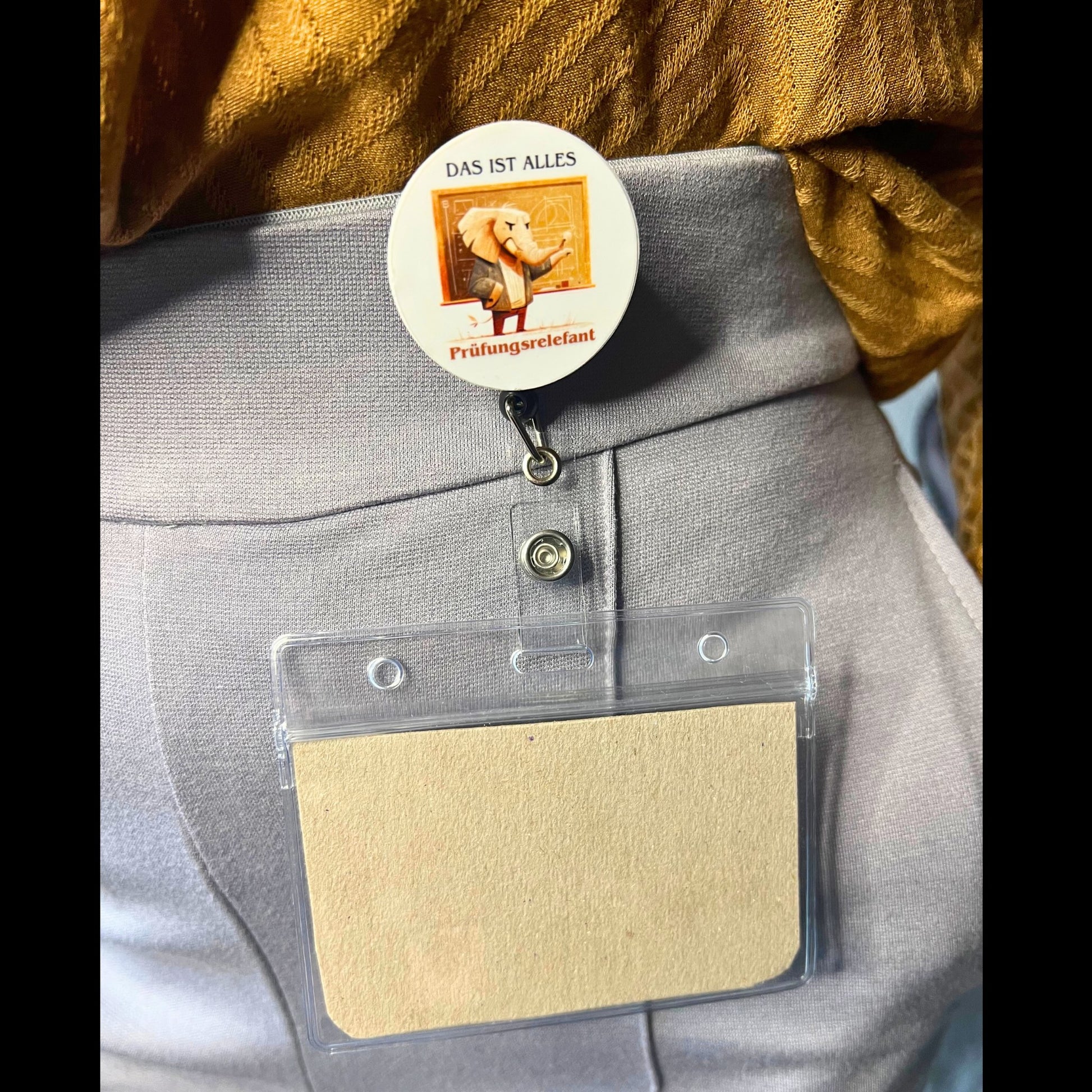 Du erhältst einen Ausweishalter mit Ziehband (schwarz oder weiß), ein magnetisch wechselbares Acryl-Design „Prüfungsrelevant“ in weiß sowie eine transparente Ausweishülle für deinen Mitarbeiterausweis. Dank Magnet lässt sich das Design jederzeit schnell austauschen – ideal zum Sammeln und Wechseln je nach Stimmung oder Fachbereich.