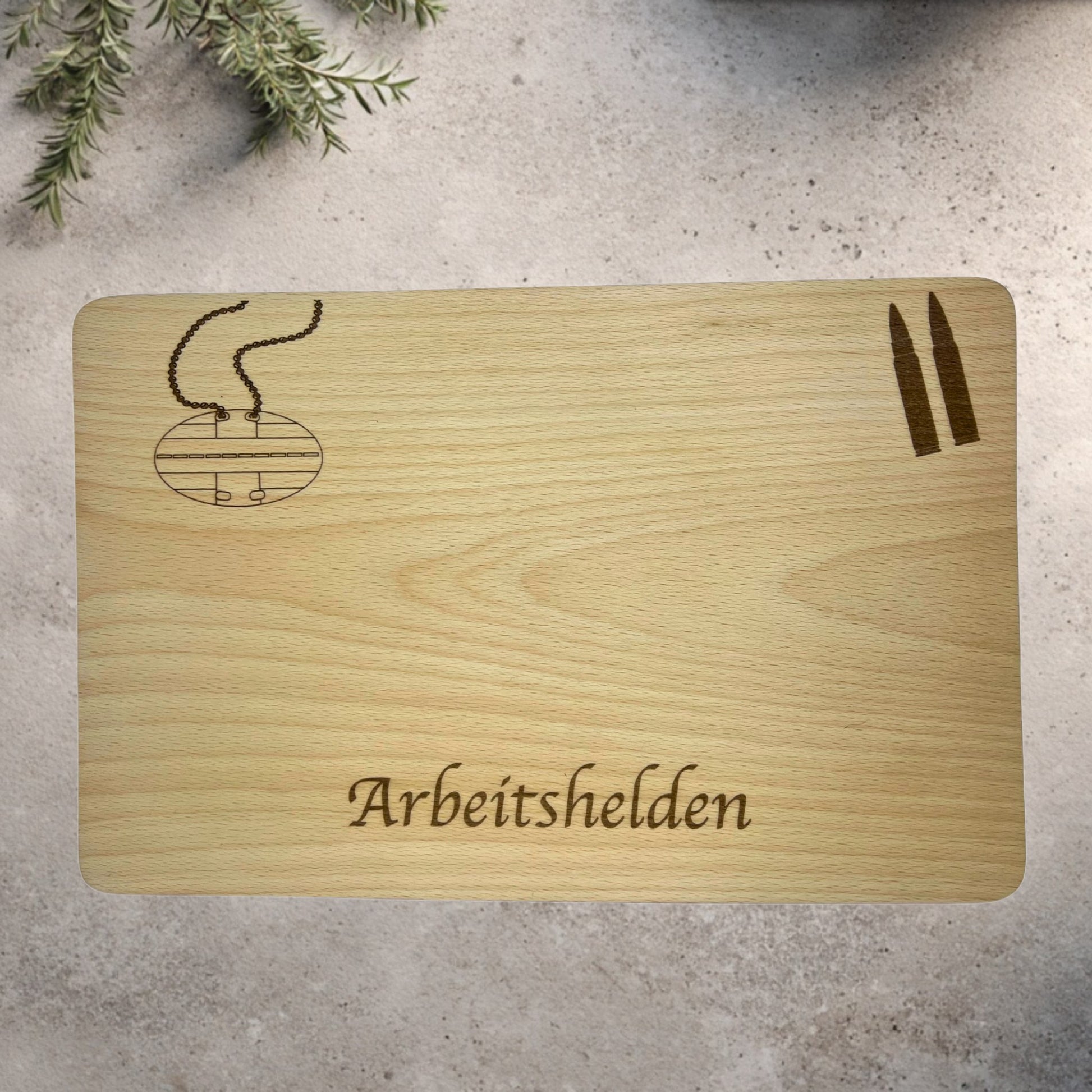 Robust, praktisch und stilvoll – dieses Schneidebrett aus Holz im Bundeswehr-Design ist dein perfekter Begleiter für jede Snackpause. Ob Schneiden, Servieren oder als Geschenk – das Brett bietet oben ein Bundeswehr-Symbol, in der Mitte ausreichend Platz zum Schneiden und unten kannst du es kostenlos personalisieren: mit Name, Dienstgrad oder kurzer Botschaft. Ideal für den Alltag im Dienst oder als Erinnerung an gemeinsame Einsätze.